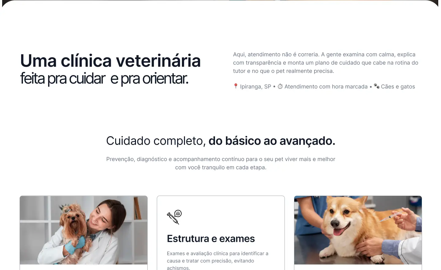 Este é um projeto fictício de site institucional para clínica veterinária, desenvolvido com objetivo de estudo e prática. A proposta foi criar uma experiência acolhedora e profissional para tutores, com informações claras sobre serviços, especialidades, cuidados preventivos e formas de contato. Todo o conteúdo é conceitual e tem finalidade exclusivamente educacional.
